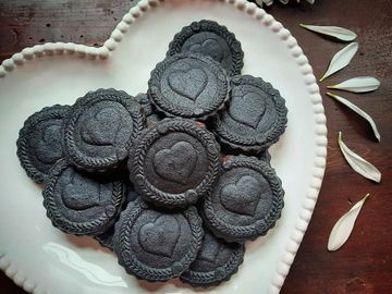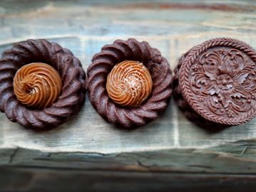 The softest dark chocolate cookie multiplied times two! A Guittard bittersweet chocolate macaronlike cookie layered with a soft Guittard bittersweet crown. Gluten free never tasted so good!